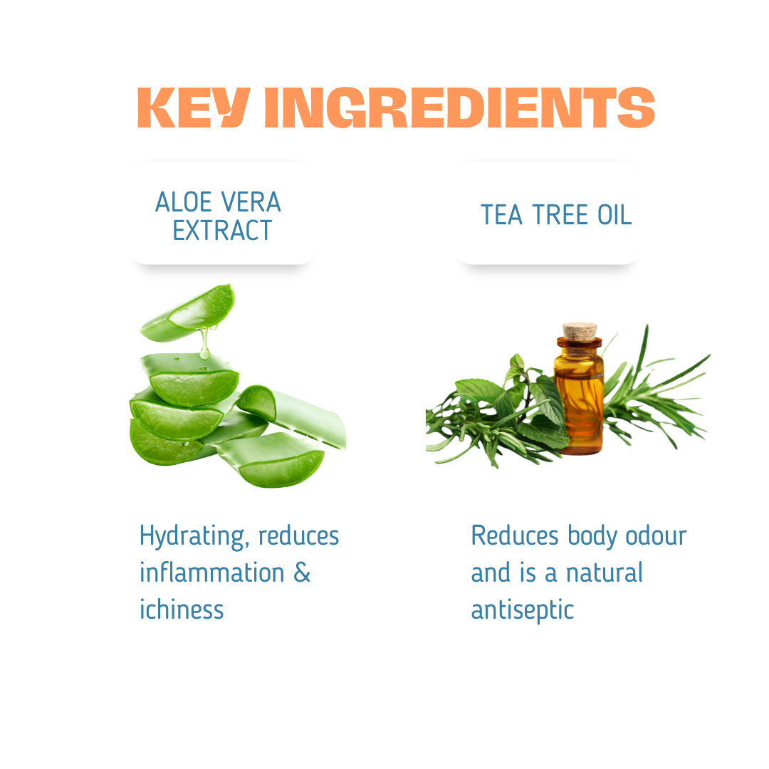 Aqua,Tea tree essential oil, Aloe Vera extract, Cocamidopropyl Betaine,Coco- Glucoside,Tocopherol Acetate,Potassium Sorbate